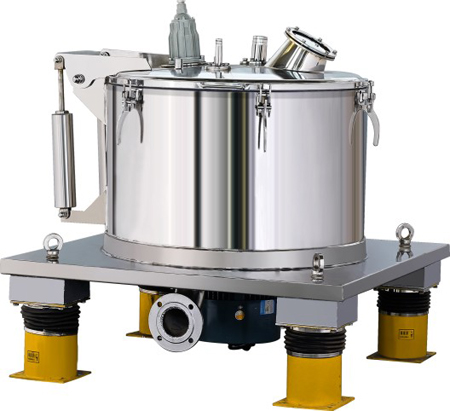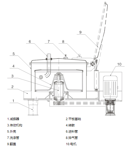 离心机均为上部卸料密闭型、间歇操作的过滤设备。物料由密闭机壳上的进料管加人转鼓,在离心力场作用下,液相穿过过滤介质排出机外,固相物截留在转鼓内,停机后打开机盖从上部卸料。具有运转平稳、操作简便和进料、洗涤、脱水在密闭状态下进行等特点。